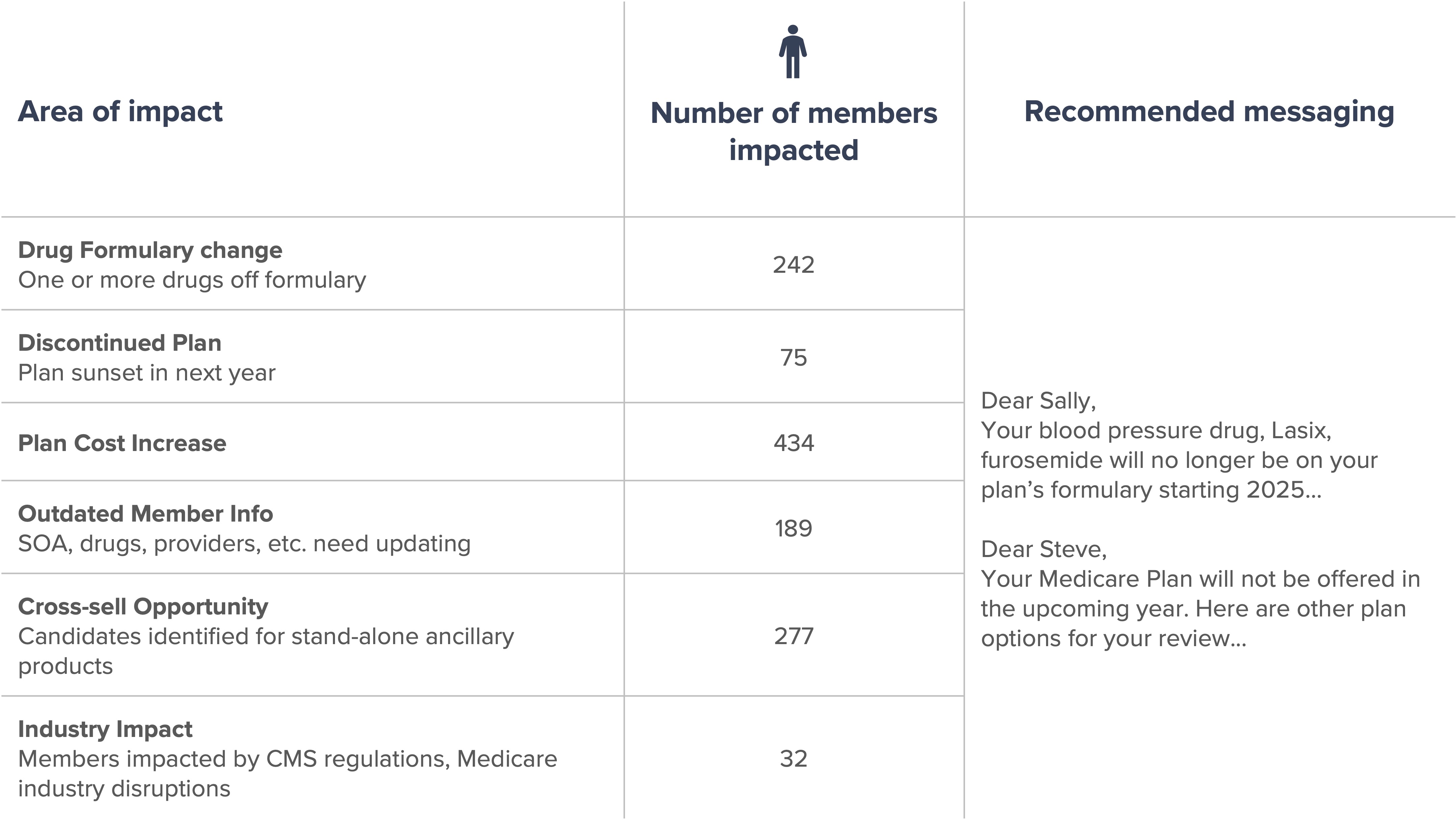 - Identify areas of impact/members affected to deliver targeted communications.